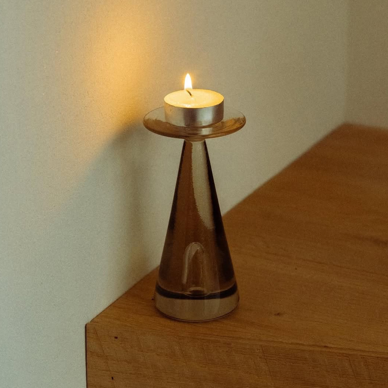 火を灯すと、ガラスの中で光が静かに広がり、テーブルや窓辺にやさしい影を落とします。
